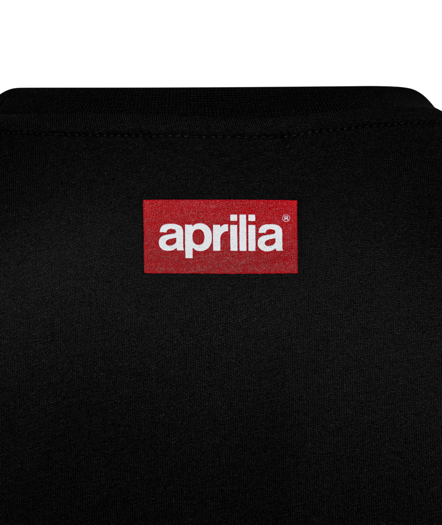 Ronde hals. Korte mouwen. Geribbelde kraag. Versterkte katoenen nekband. Aprilia logo gedrukt op de voorkant. Aprilia-logo gedrukt op de achterkant. Applicatie op de mouw met zachte PVC patch. Geborduurd stoffen label met Aprilia logo.