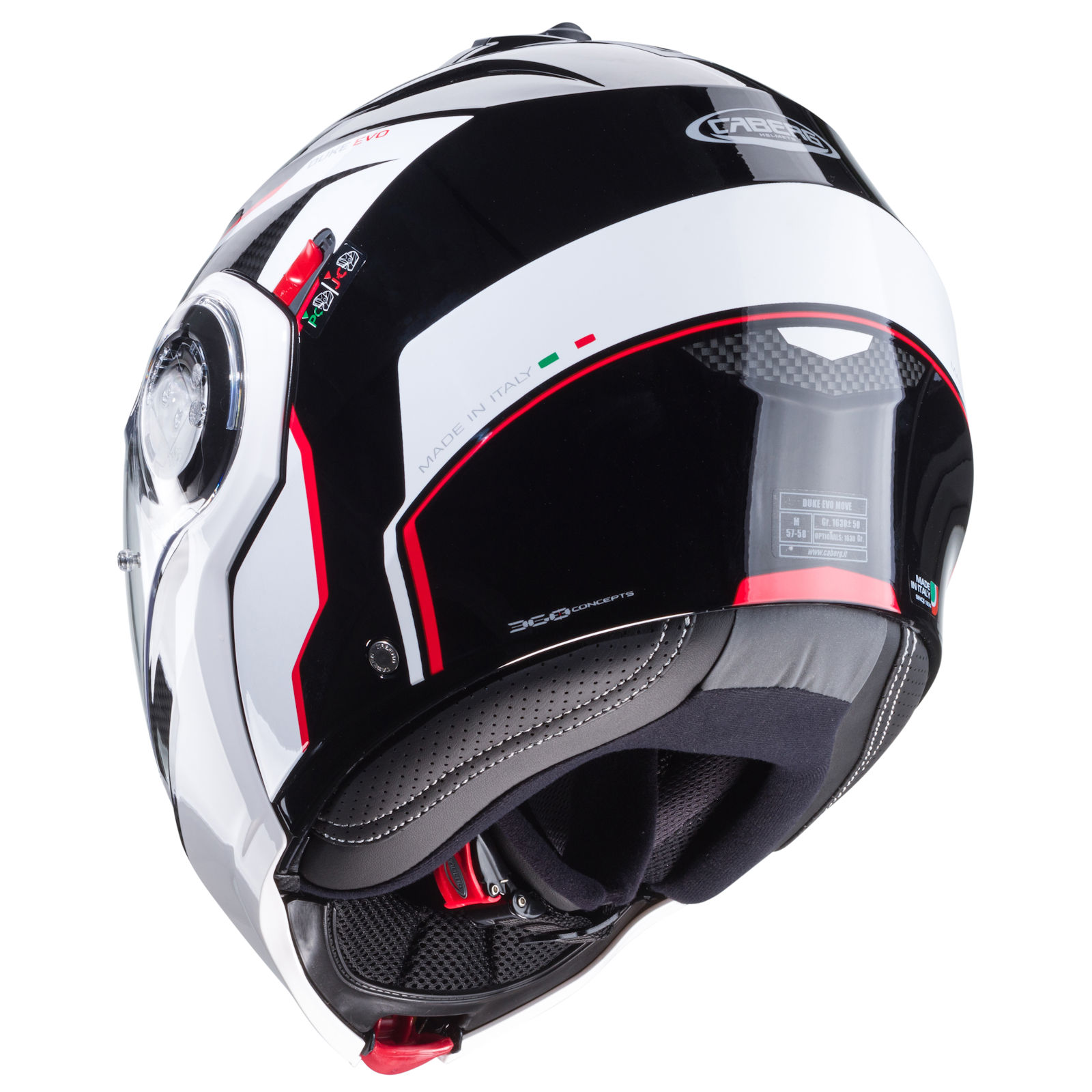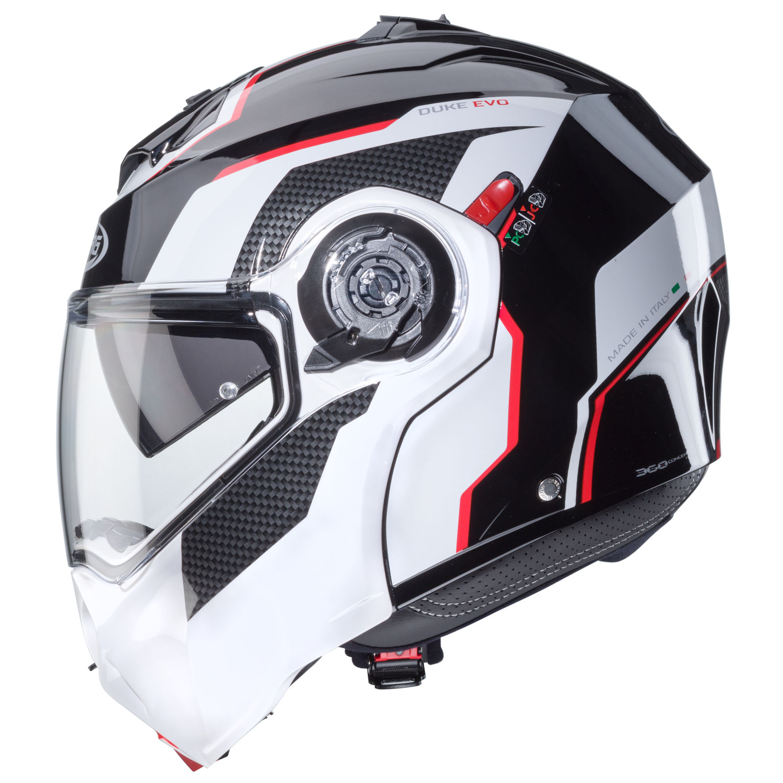 De Caberg Duke Evo flip-up helm met Move decor in de kleuren zwart/wit/rood heeft de volgende kenmerken: