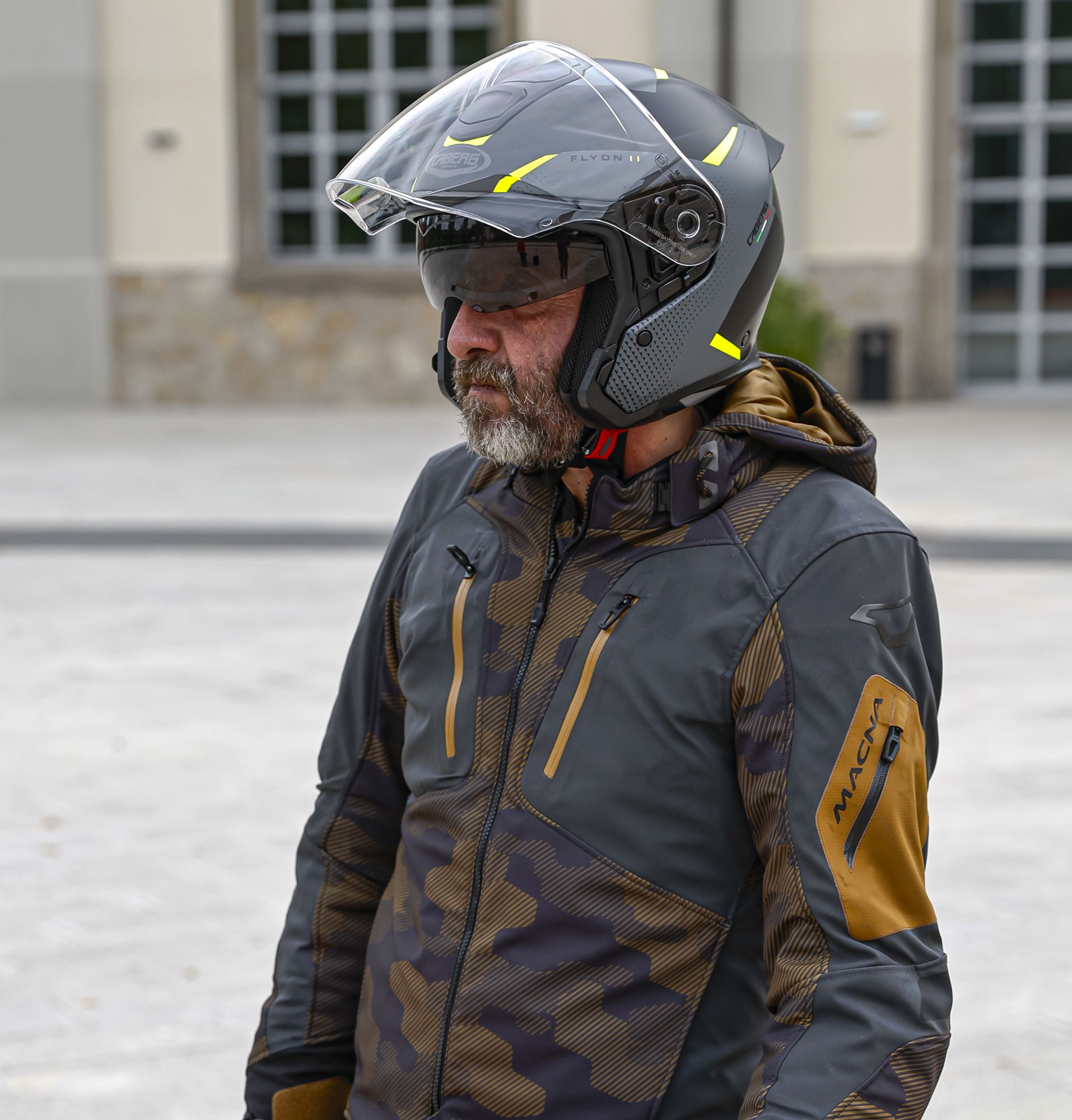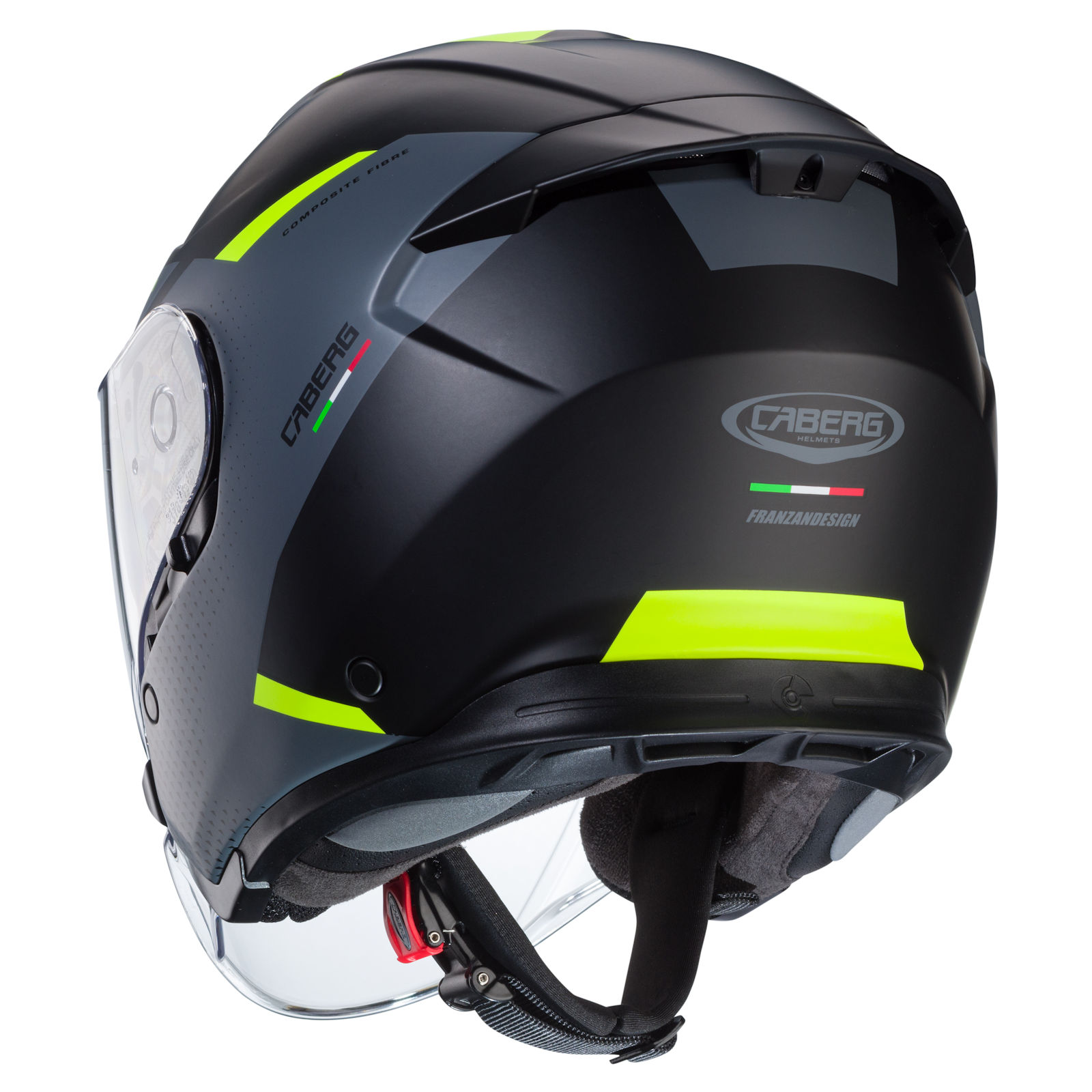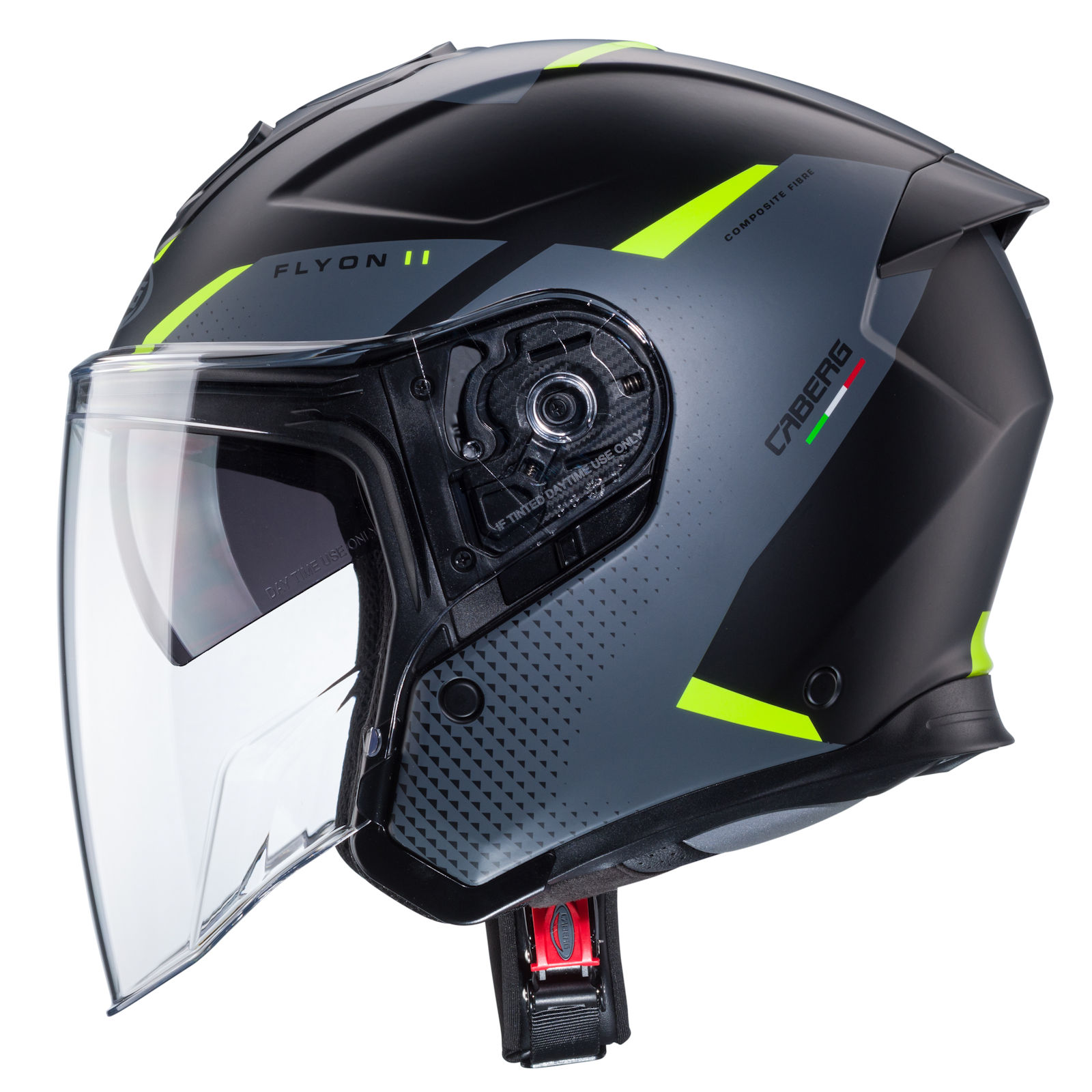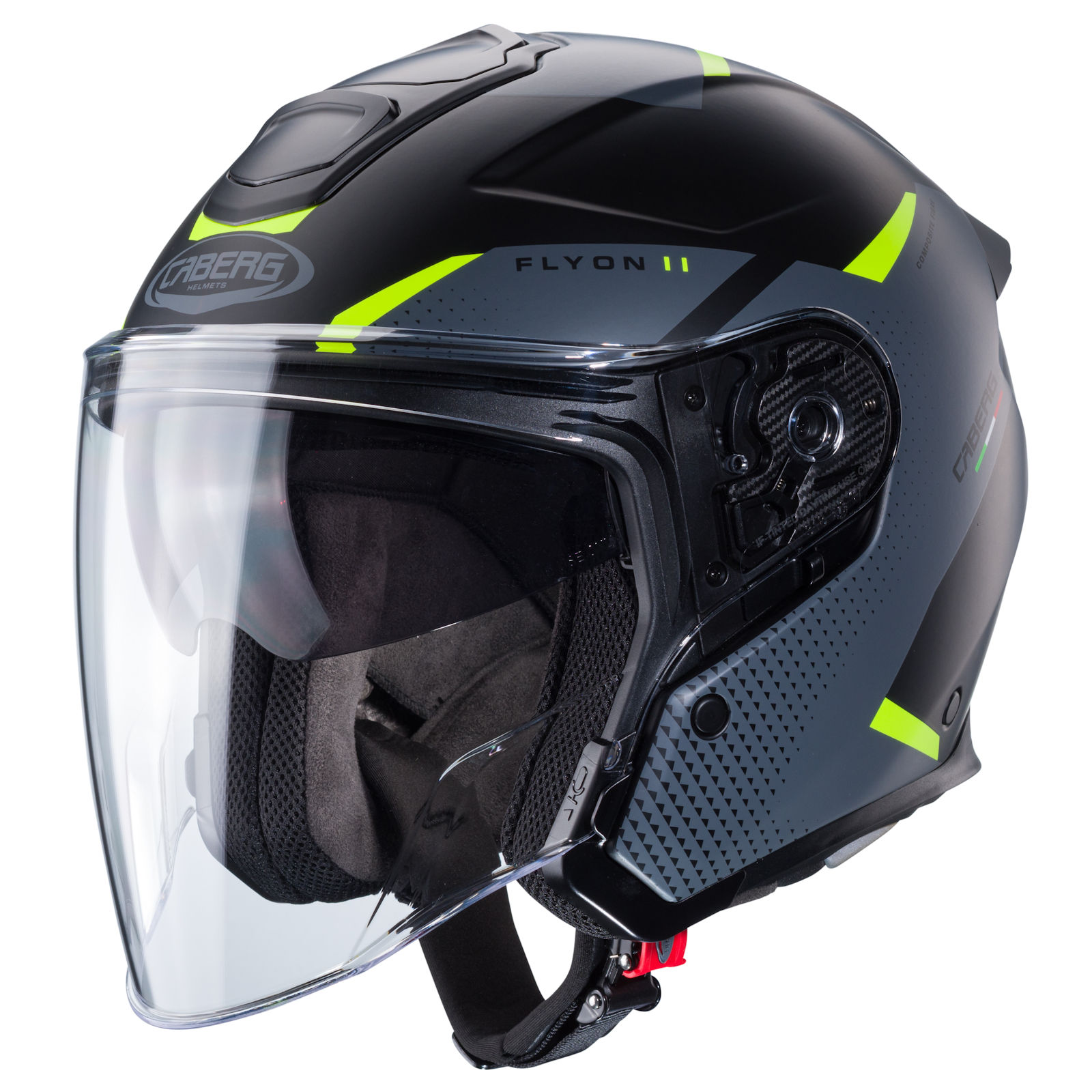 De Caberg Flyon II jethelm met het Boss decor in de kleuren mat zwart/grijs fluo geel heeft de volgende eigenschappen: