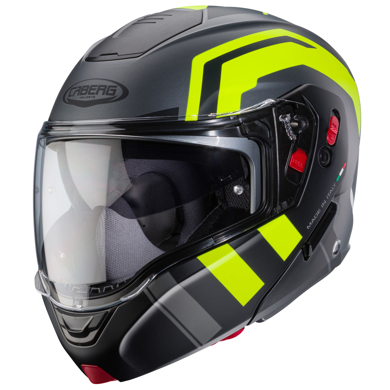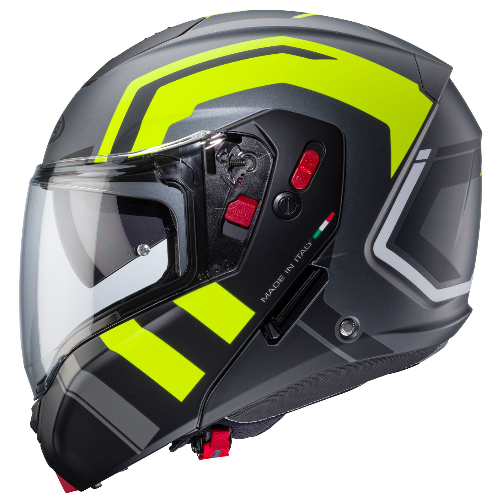 De Caberg Horus X flip-up helm met Road decor in de kleuren mat gun metallic/zwart fluo geel heeft de volgende kenmerken: