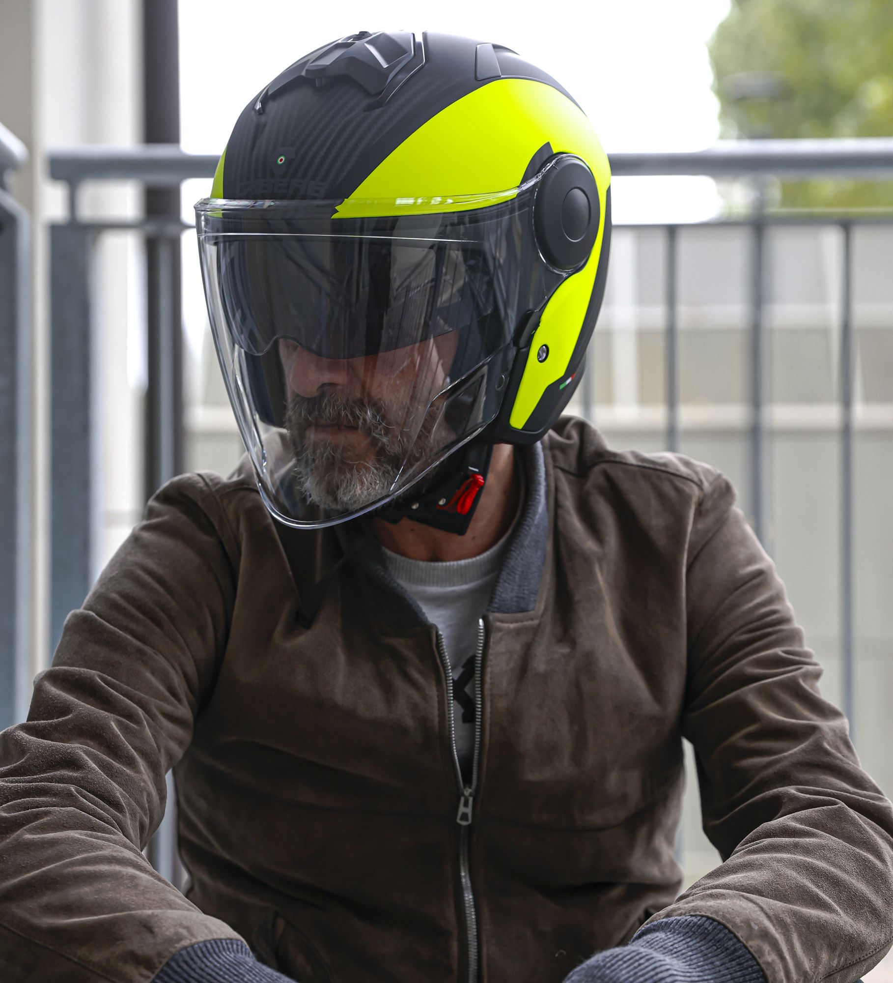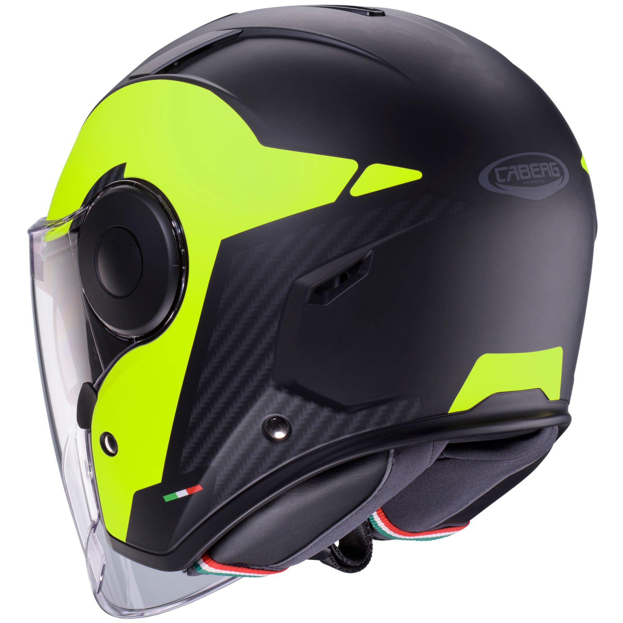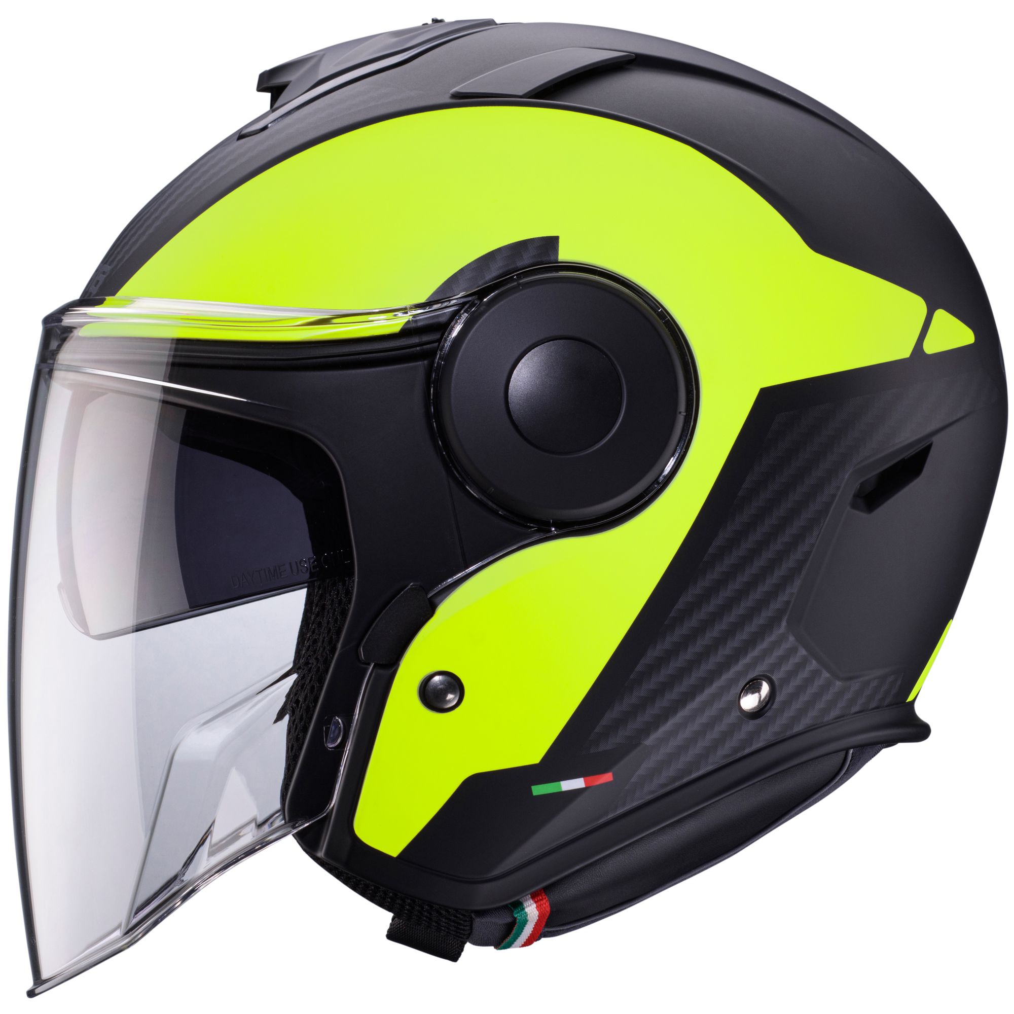 De Caberg Soho jethelm met Milano decor in de kleuren mat zwart/fluo geel heeft de volgende kenmerken: