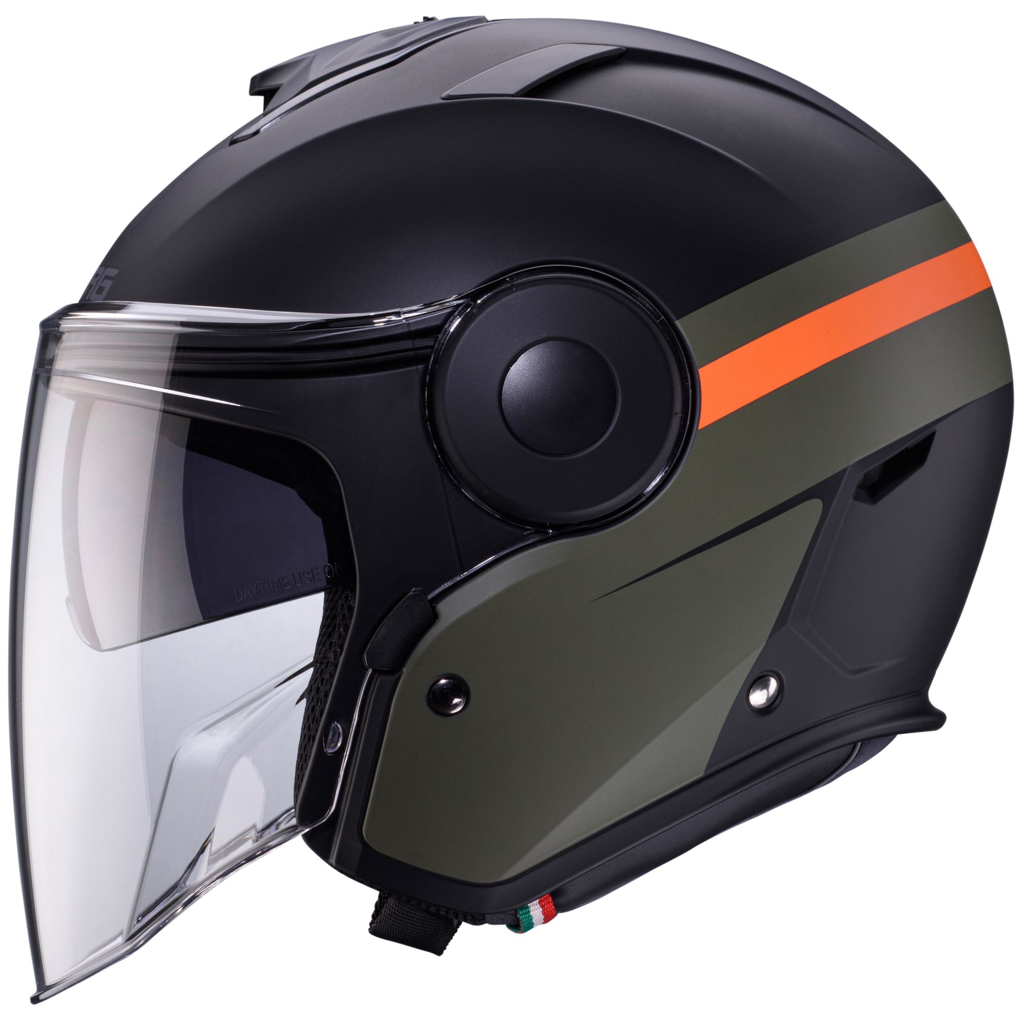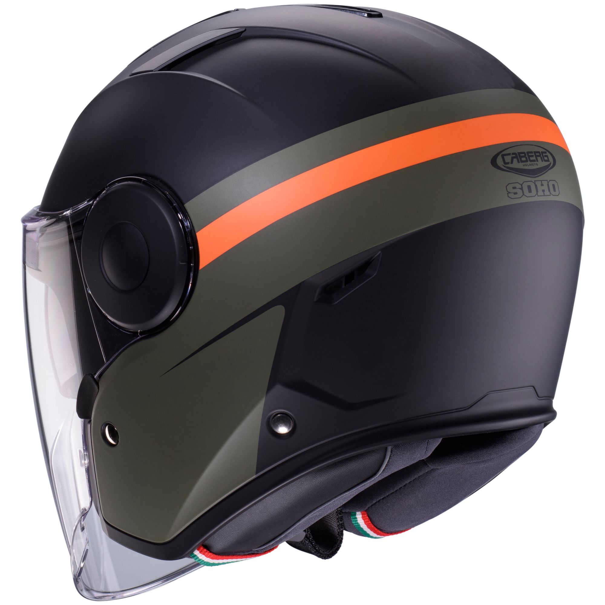 De Caberg Soho jethelm met Zephyr decor in de kleuren mat zwart/groen-oranje heeft de volgende kenmerken: