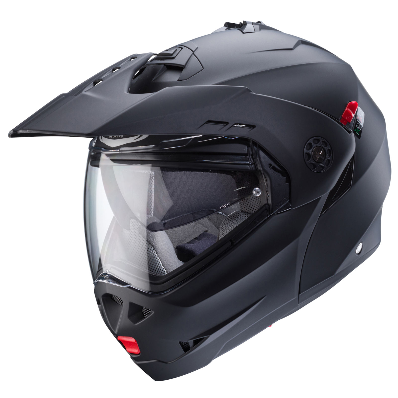 De Caberg Tourmax X helm is een flip-up adventure helm speciaal ontwikkeld voor enduro motorrijders. Deze comfortabele flip-up helm, getest volgens de huidige ECE 22.06 norm, biedt de mogelijkheid om met het voorste gedeelte open of gesloten te rijden. Een praktische hendel in de "J" positie vergrendelt de kinbeschermer in de volledig geopende stand en voorkomt onbedoeld sluiten - ideaal voor maximale veiligheid en flexibiliteit. Deze opklapbare helm is ideaal voor zowel veeleisende off-roadtochten als ontspannen autoritten op vakantie. Het kinstuk kan met slechts één handbeweging worden opgeklapt en veilig worden vastgezet. Beide draagopties - open en gesloten - zijn uitgebreid getest (dubbele homologatie) om aan de hoogste veiligheidsnormen te voldoen. Comfortabel en functioneel uitgerust zorgt de helm met zijn uitneembare, ademende en wasbare binnenvoering en individueel instelbare ventilatie in het kin- en voorhoofdgedeelte voor een aangename rijervaring, zelfs tijdens lange tochten. Het Pinlock® dubbele vizier zorgt samen met het geïntegreerde zonnevizier altijd voor een helder zicht. De helm kan optioneel worden uitgerust met een Bluetooth-systeem voor extra entertainment, navigatie en communicatie.