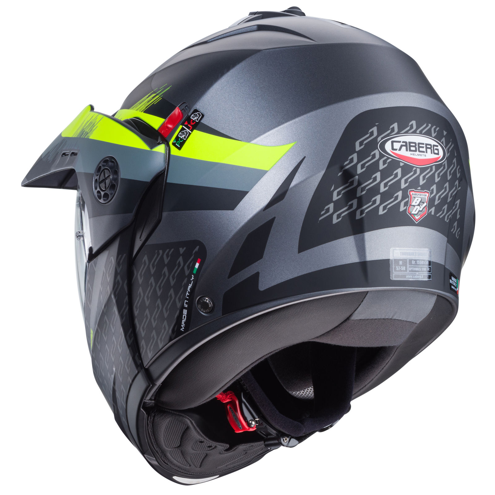 De Caberg Tourmax X flip-up helm met Sarabe decor in de kleuren mat-gun metallic/zwart-fluo-geel heeft de volgende eigenschappen: