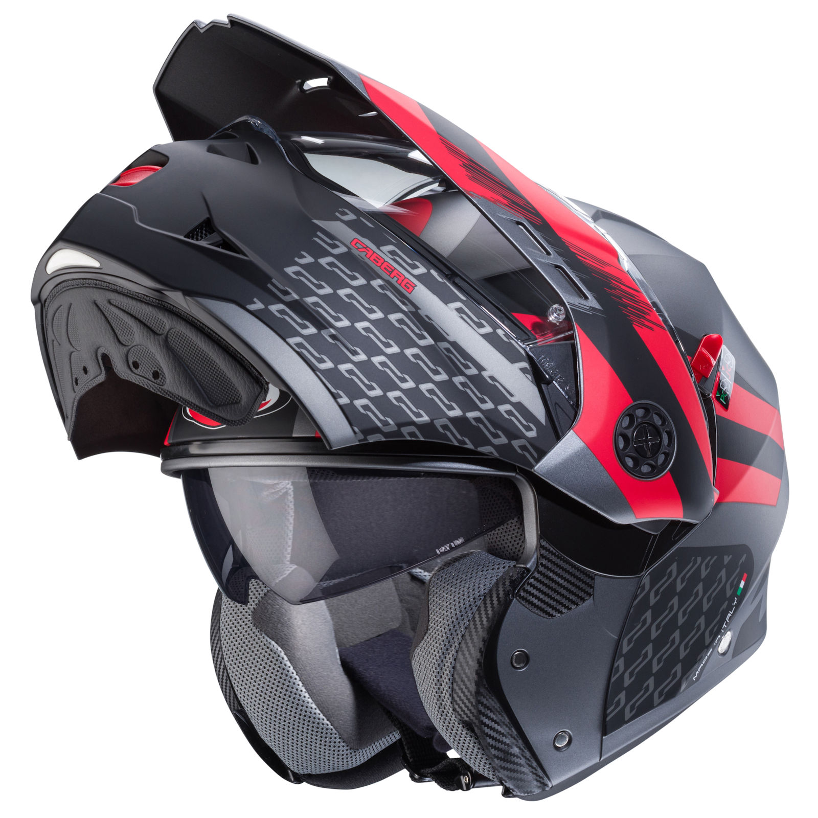 De Caberg Tourmax X flip-up helm met Sarabe decor in de kleuren mat-gun metallic/zwart-rood heeft de volgende kenmerken: