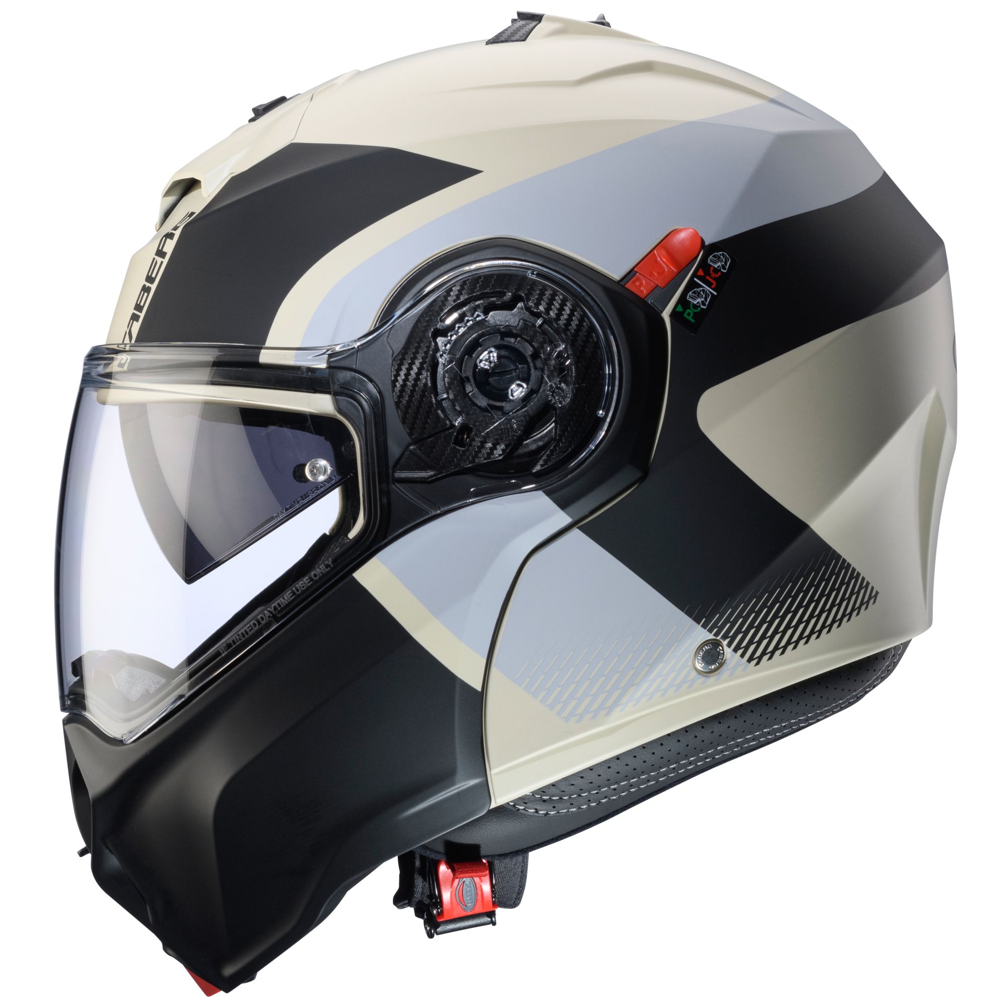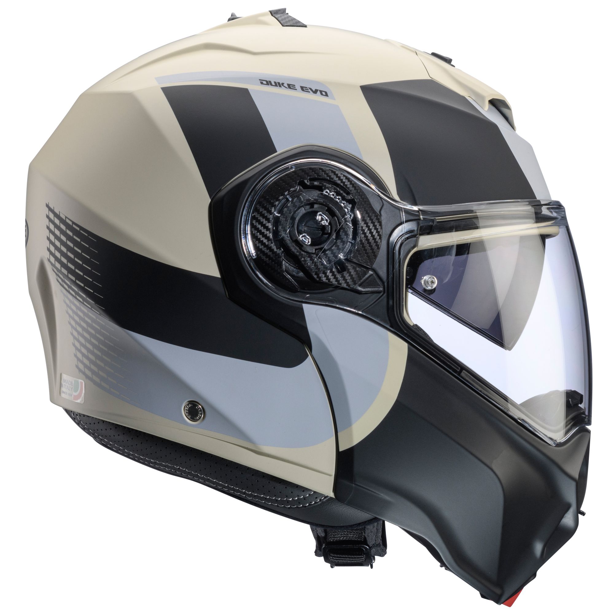 De Caberg Duke Evo flip-up helm met Indy decor in de kleuren mat zand/zwartgrijs heeft de volgende kenmerken: