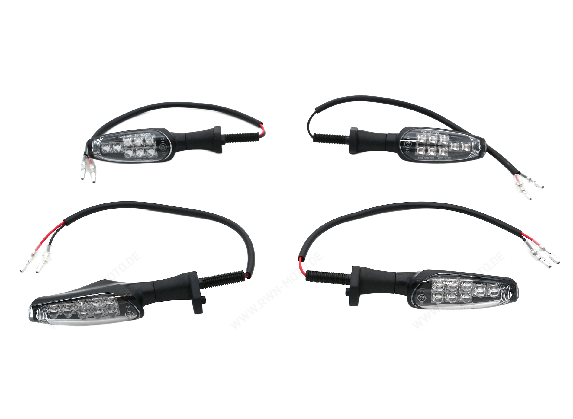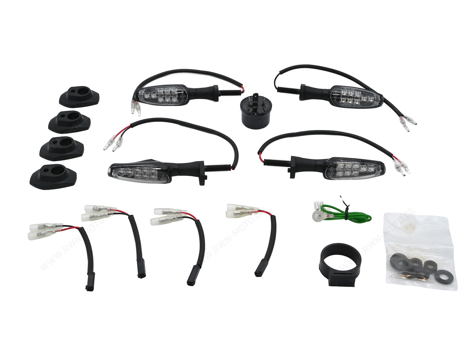 High-tech LED richtingaanwijzers. Set bestaat uit twee knipperlichten voor en twee knipperlichten achter incl. kabels en relais. Laag stroomverbruik van 1,2Watt per indicator. 8 heldere LED's per indicator.