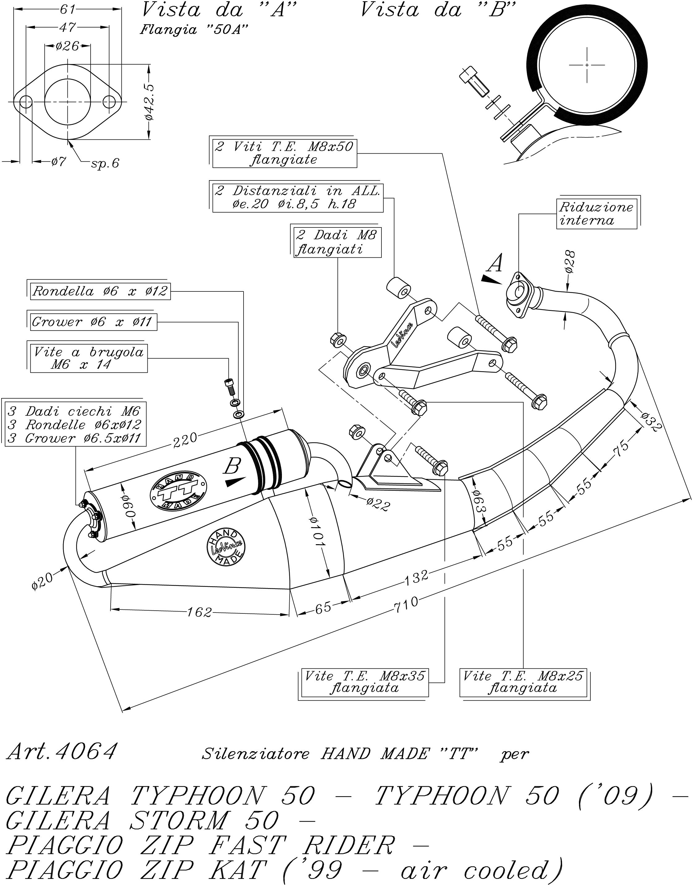 De EC-goedgekeurde HAND MADE TT uitlaat heeft een 10/10 stalen expansiekamer met een open dubbel-kamer intern ontwerp. De ronde achterdemper is eveneens van staal en presenteert zich in "Scotch Brite" design, met geanodiseerde aluminium buitenmantel.