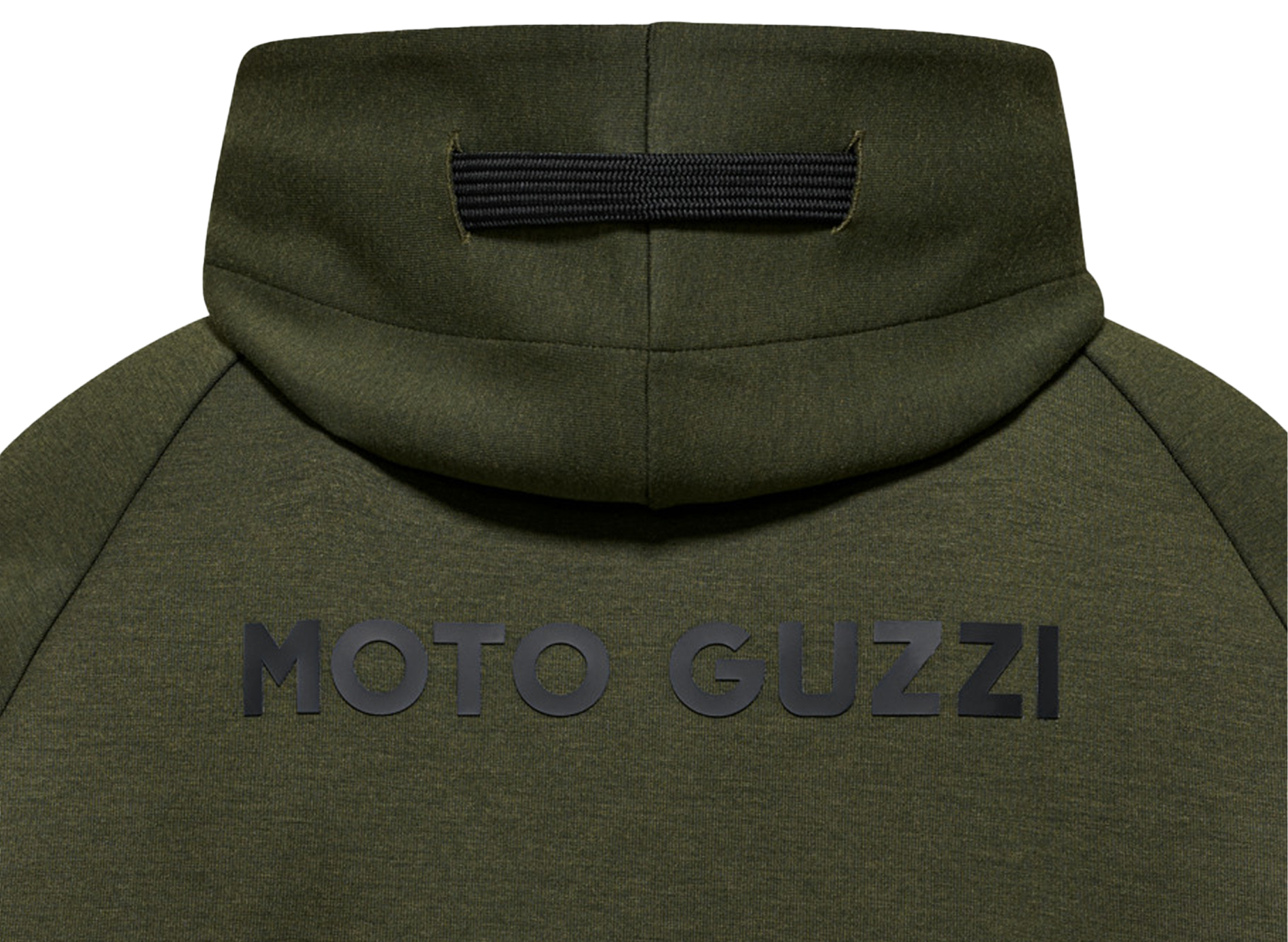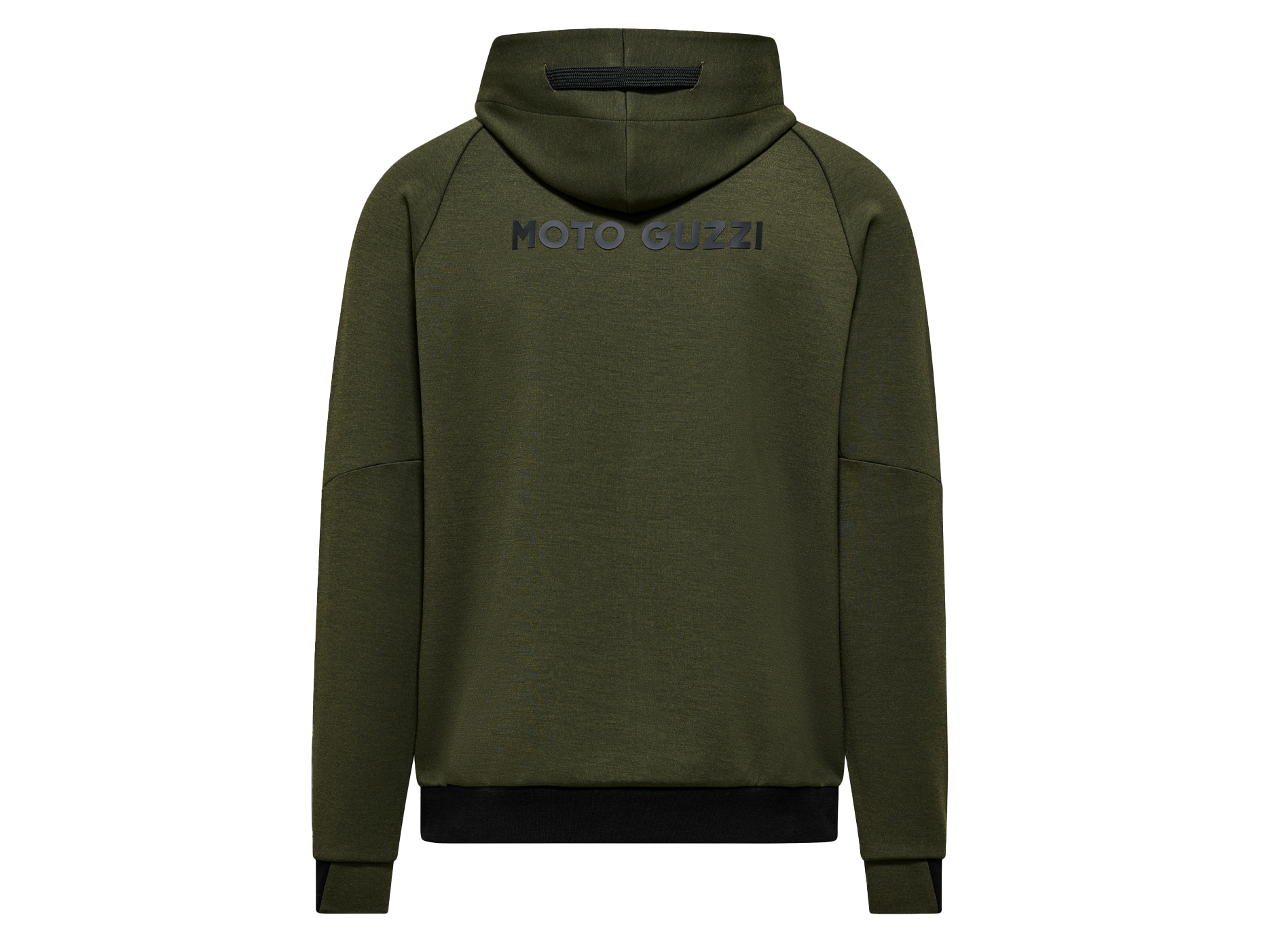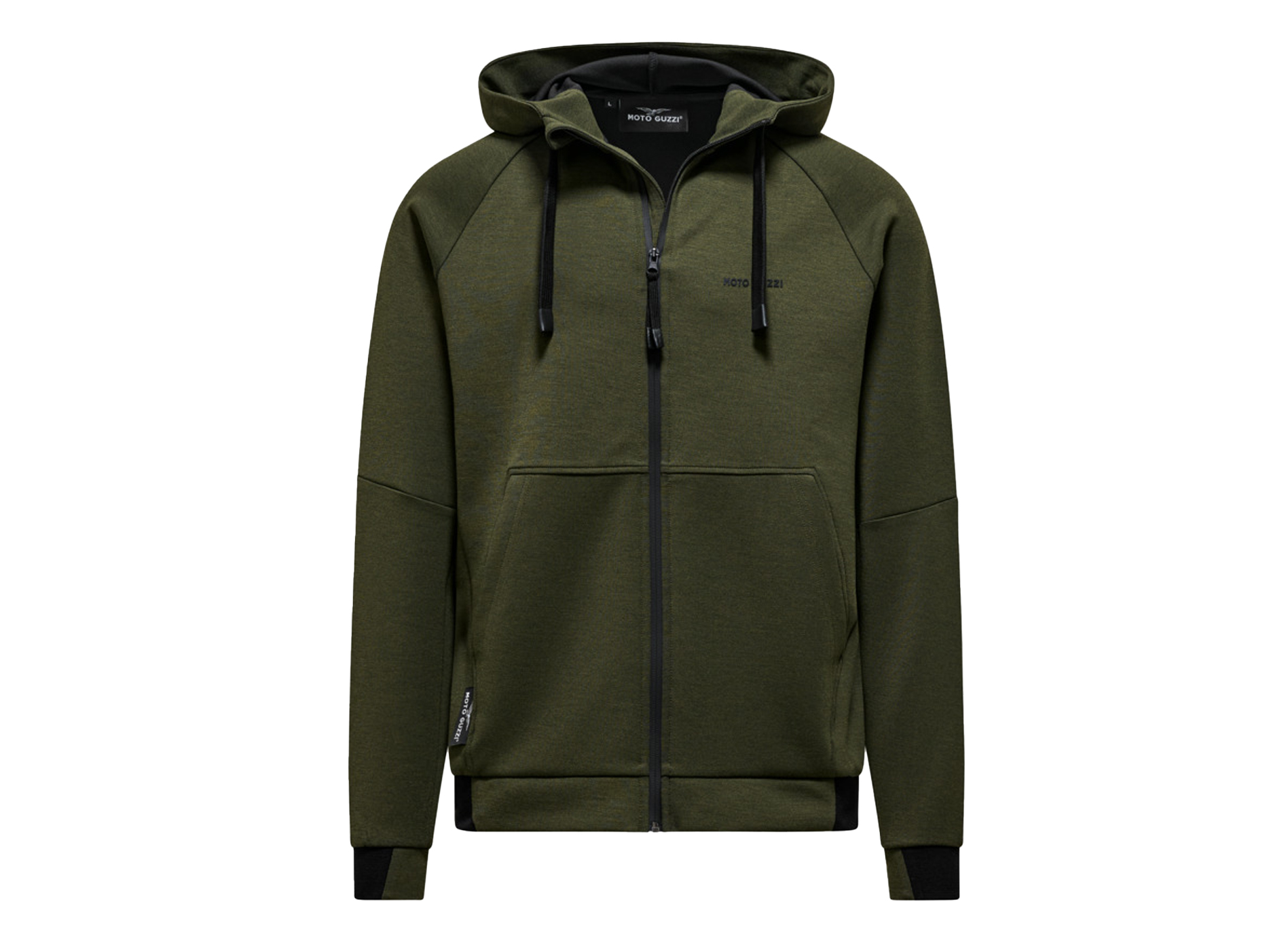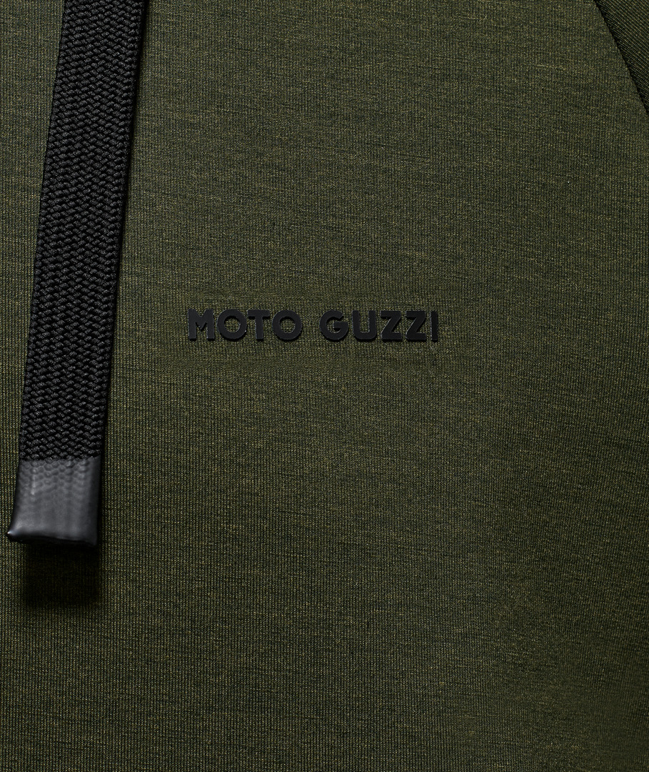 Sweatshirt van scubastof met rubberen MOTO GUZZI opdruk op de borst en rug. Met verstelbare capuchon, doorlopende ritssluiting en kangoeroezakken. Raglanmouwen, een sportieve herinterpretatie van een herenklassieker. Het op de zijkant genaaide MOTO GUZZI logo voegt een opvallend accent toe, terwijl de contrasterende manchetten van dubbele stof aan de mouwen en zoom zorgen voor stijl en comfort.