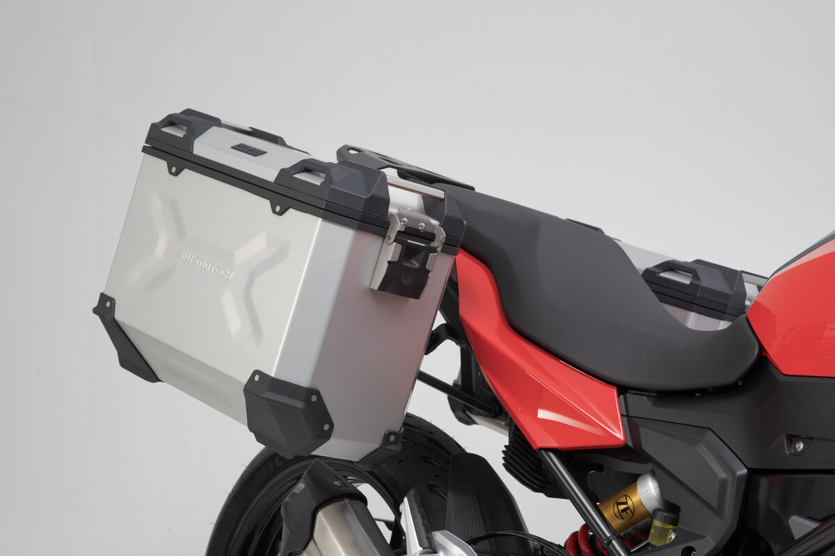 De robuuste TRAX ADV aluminium koffers voelen zich thuis op elk circuit: design reliëf ondersteunt de stabiliteit van het 1,5 millimeter dikke gelaste aluminium wandmateriaal. Een volledig afneembaar deksel met geanodiseerde aluminium handgrepen en snelsluitingen maakt het in- en uitladen van de motorkoffers gemakkelijk, terwijl de schuine zijrand voor een grote bodemvrijheid in de bochten zorgt. Met deze complete oplossing beschikt u over alle componenten die u nodig hebt om met TRAX op een grote reis te gaan: Twee waterdichte TRAX ADV zijkoffers, twee afneembare SW-MOTECH zijkoffers, adapterset, slotenset, openingsbegrenzer en antidiefstalapparaat voor een aantrekkelijke totaalprijs. De modelspecifieke dragers en de afmetingen van de koffers zijn perfect afgestemd op de achtergeometrie en het uitlaatsysteem van de motorfiets.