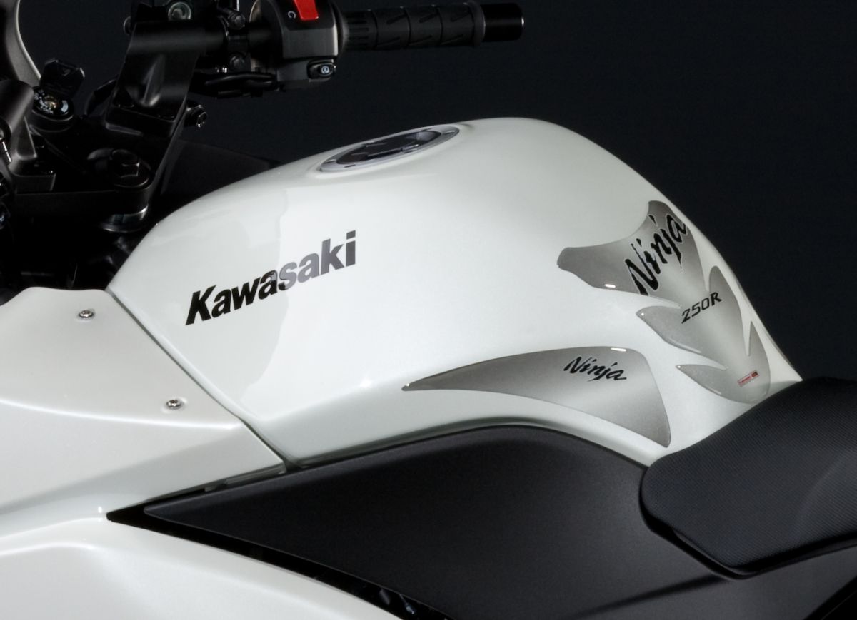 Topklasse zelfklevende gel-hars tankbeschermer. Uniek en driedelig, met het Ninja 250R logo, semi-transparant, onthult de originele kleur van de tank.