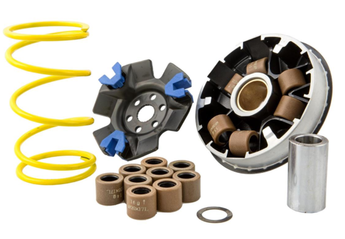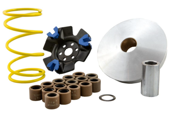 Een klein maar uiterst fijn afstelbaar onderdeel op scootergebied is de variator, want die vormt het hart van de aandrijving van elke automatische scooter. De installatie van een geoptimaliseerde variator bepaalt dus niet alleen de acceleratie en de tractie, maar ook de vlotte werking van een voertuig. Een must voor alle 2/4-takt piloten! De ZELIONI variator is speciaal ontwikkeld voor het gewicht en de wielgrootte van de Vespa GTS/GT modellen. Zeer nauwkeurige CNC-productie van de rupsbanden met exact berekende hellingshoek voor optimale acceleratie en maximale topsnelheid. Vario tegendrukveer, verschillende vario gewichten en afstandsstukken zijn inbegrepen.