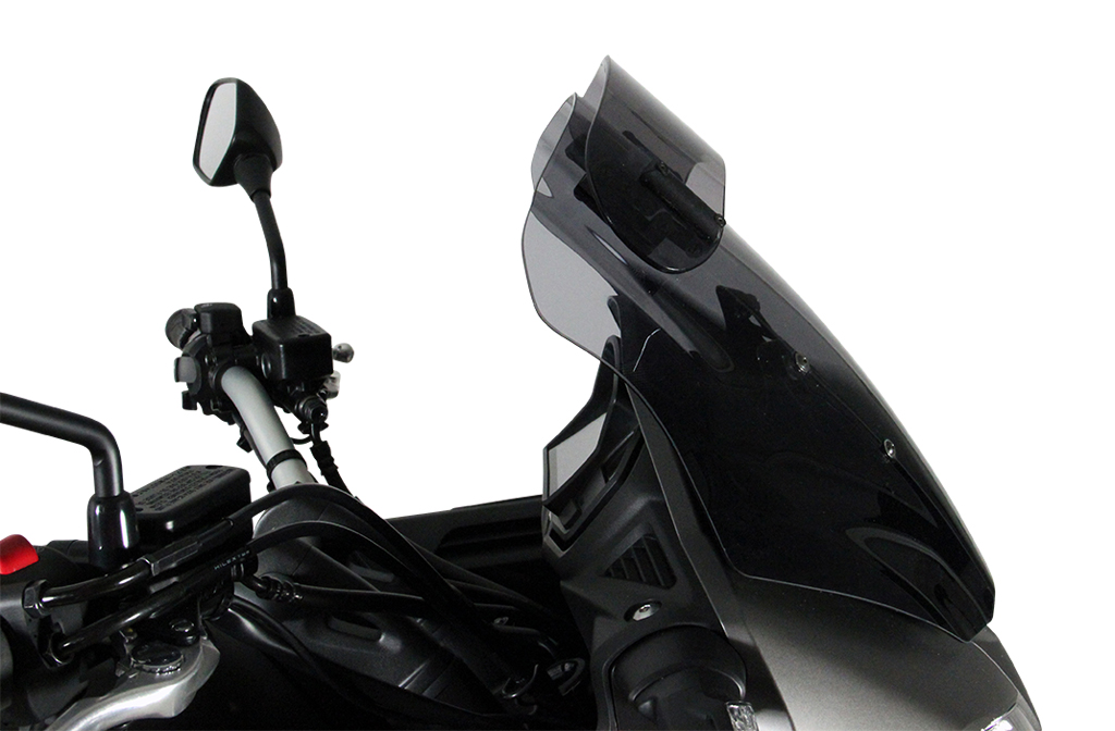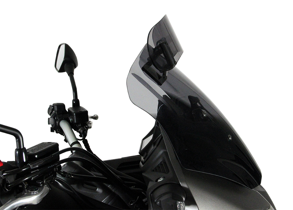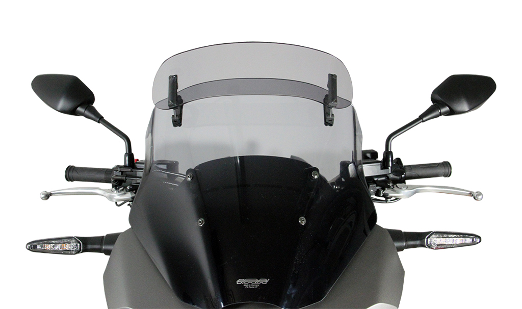 Deze touring voorruit heeft een spoiler aan het uiteinde die handmatig in zeven stappen in de gewenste stand kan worden gezet. De achterste stroom van de spoiler neemt de winddruk van de rijder weg en vermindert tegelijkertijd de turbulentie. Het Vario- Touringscherm is verkrijgbaar in helder en rookgrijs.