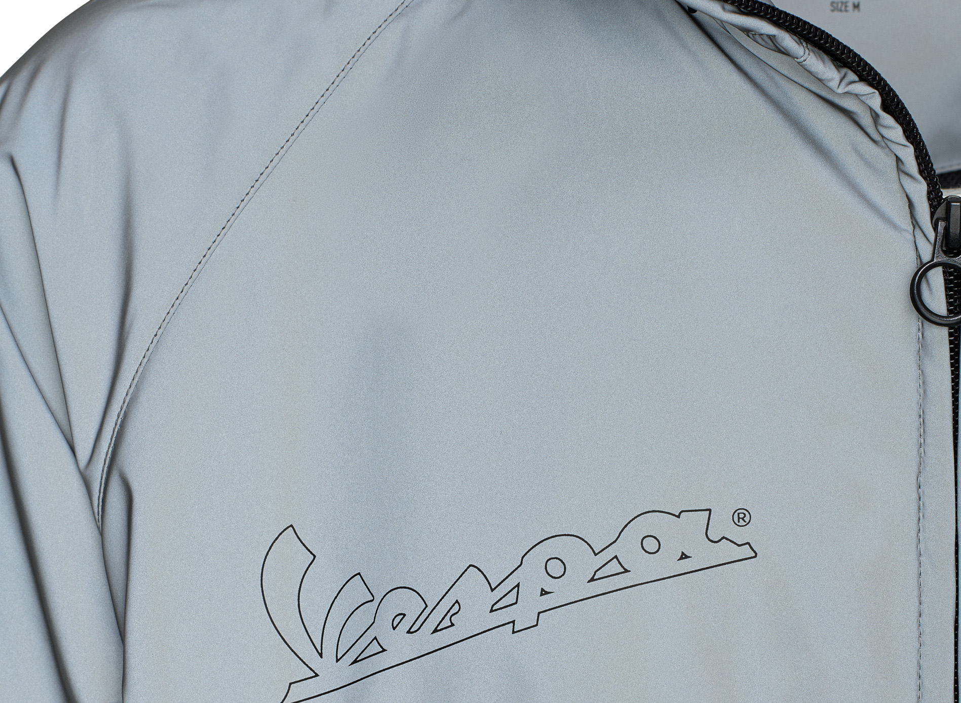 Weiche und leichte Windjacke mit wasserabweisender Behandlung. Die Jacke ist mit dem Vespa-Logo und der neuen Vespa-DEC-Grafik individuell gestaltet, die auf die Geschichte der Marke verweist. Ein atmungsaktives Netzfutter in der gleichen Farbe sorgt für zusätzlichen Komfort. Aus dem unsichtbaren Reißverschluss hinten am Kragen kann die Kapuze herausgezogen werden. Das neue aufgedruckte Innenetikett ist nur eines der Beispiele für die sorgfältige Detailpflege, die diese Jacke zu einem außerordentlichen Kleidungsstück macht. Die Farbe der Klinge wurde mit einem reflektierendem Gewebe hergestellt.