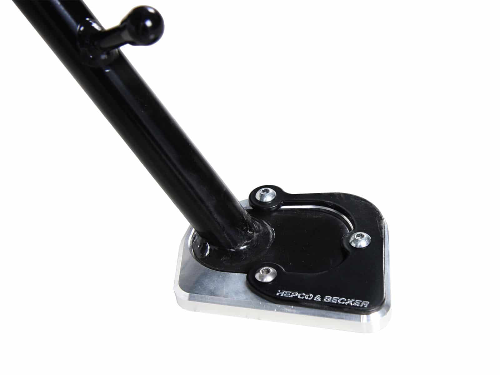 Vooral bij volle belading of op onverharde ondergrond kan de motor gemakkelijk wegzakken en omvallen op de zijstandaard. Een modelspecifieke, gegoten zijstandaardplaat van Hepco & Becker wordt aanbevolen om je motor van dit gevaar te bevrijden. Door de steun van de zijstandaard te vergroten tot ongeveer het dubbele oppervlak in vergelijking met de originele standaard,  isje motor perfect beschermd tegen ongelukken bij het parkeren.